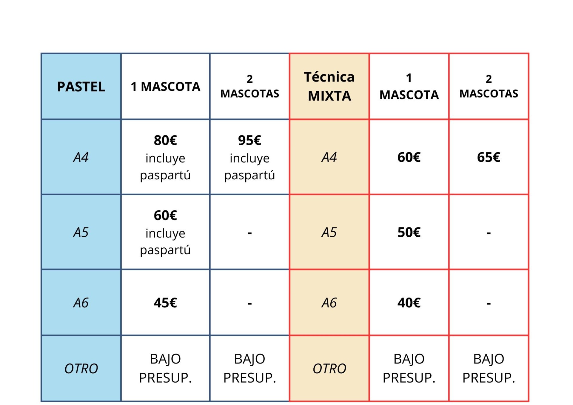 - Formato: A4/A5/A6. Para dos mascotas el formato es apaisado y se hace solamente en A4.